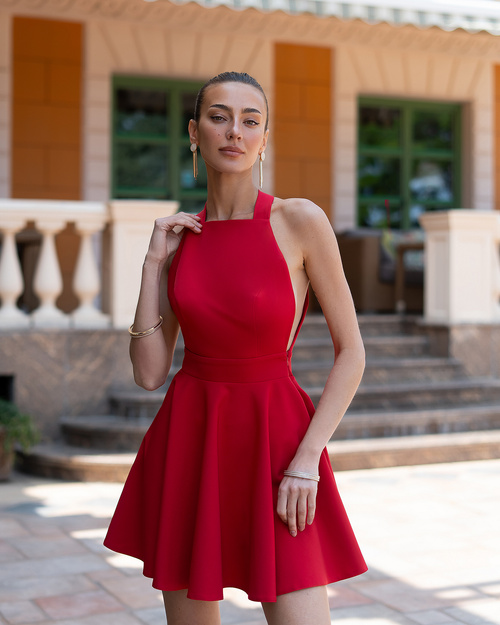 Czerwona rozkloszowana sukienka mini bez rękawów z wiązaniem na plecach